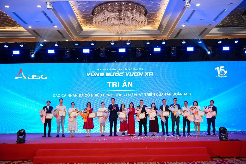 Tại buổi lễ, Tập đoàn ASG đã vinh danh 15 CBNV Tập đoàn và tri ân 26 cá nhân tiêu biểu đến từ các công ty thành viên có nhiều đóng góp trong suốt chặng đường phát triển, đặc biệt là những nhân sự gắn bó từ những ngày đầu thành lập. Cùng với đó là lễ trao giải cuộc thi nội bộ chào mừng kỷ niệm 15 năm: “ASG – Sáng tạo đổi mới để vươn xa”, “Tự hào ASG”, “Rực rỡ ASG” và “Khoảnh khắc ASG”, góp phần lan tỏa tinh thần sáng tạo và gắn kết trong toàn Tập đoàn.