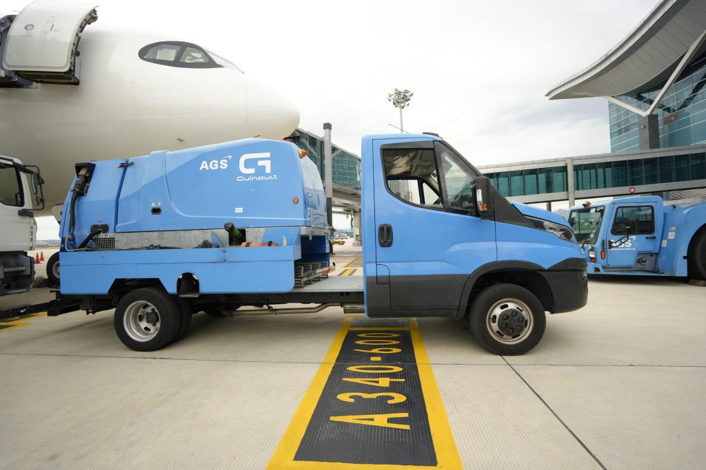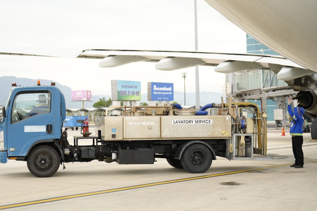 10. Xe phục vụ vệ sinh tàu bay – Lavatory Service Vehicle: Xe được thiết kế các ống lớn để hút chất thải trong buồng vệ sinh và cấp nước buồng vệ sinh máy bay.