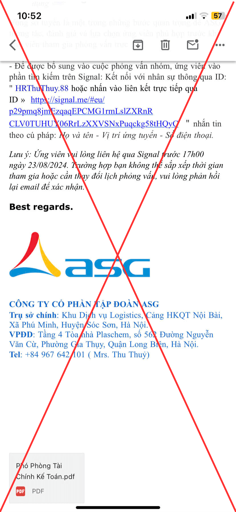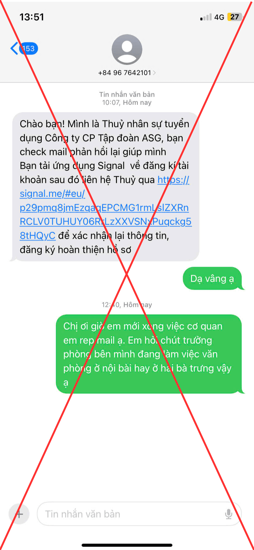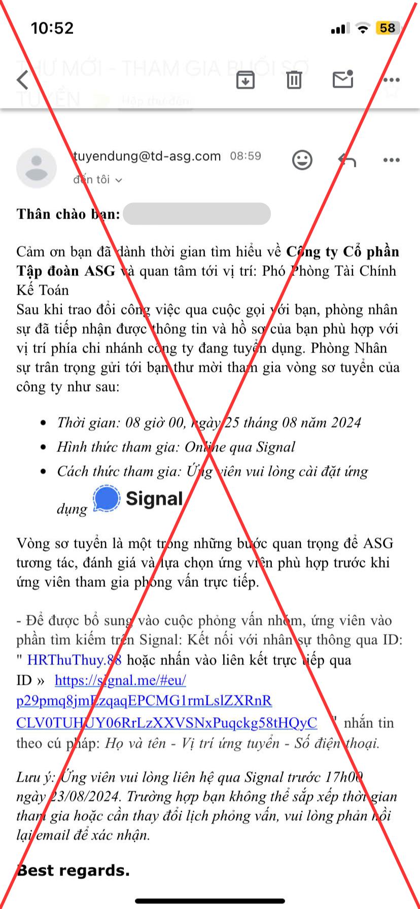 Hiện Tập đoàn ASG tiếp tục ghi nhận tình trạng về việc các nhóm/đối tượng sử dụng trái phép danh nghĩa, hình ảnh của Tập đoàn ASG để thực hiện hành vi tuyển dụng, lừa đảo…