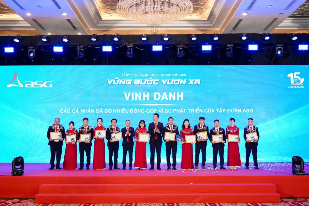 Tại buổi lễ, Tập đoàn ASG đã vinh danh 15 CBNV Tập đoàn và tri ân 26 cá nhân tiêu biểu đến từ các công ty thành viên có nhiều đóng góp trong suốt chặng đường phát triển, đặc biệt là những nhân sự gắn bó từ những ngày đầu thành lập. Cùng với đó là lễ trao giải cuộc thi nội bộ chào mừng kỷ niệm 15 năm: “ASG – Sáng tạo đổi mới để vươn xa”, “Tự hào ASG”, “Rực rỡ ASG” và “Khoảnh khắc ASG”, góp phần lan tỏa tinh thần sáng tạo và gắn kết trong toàn Tập đoàn.