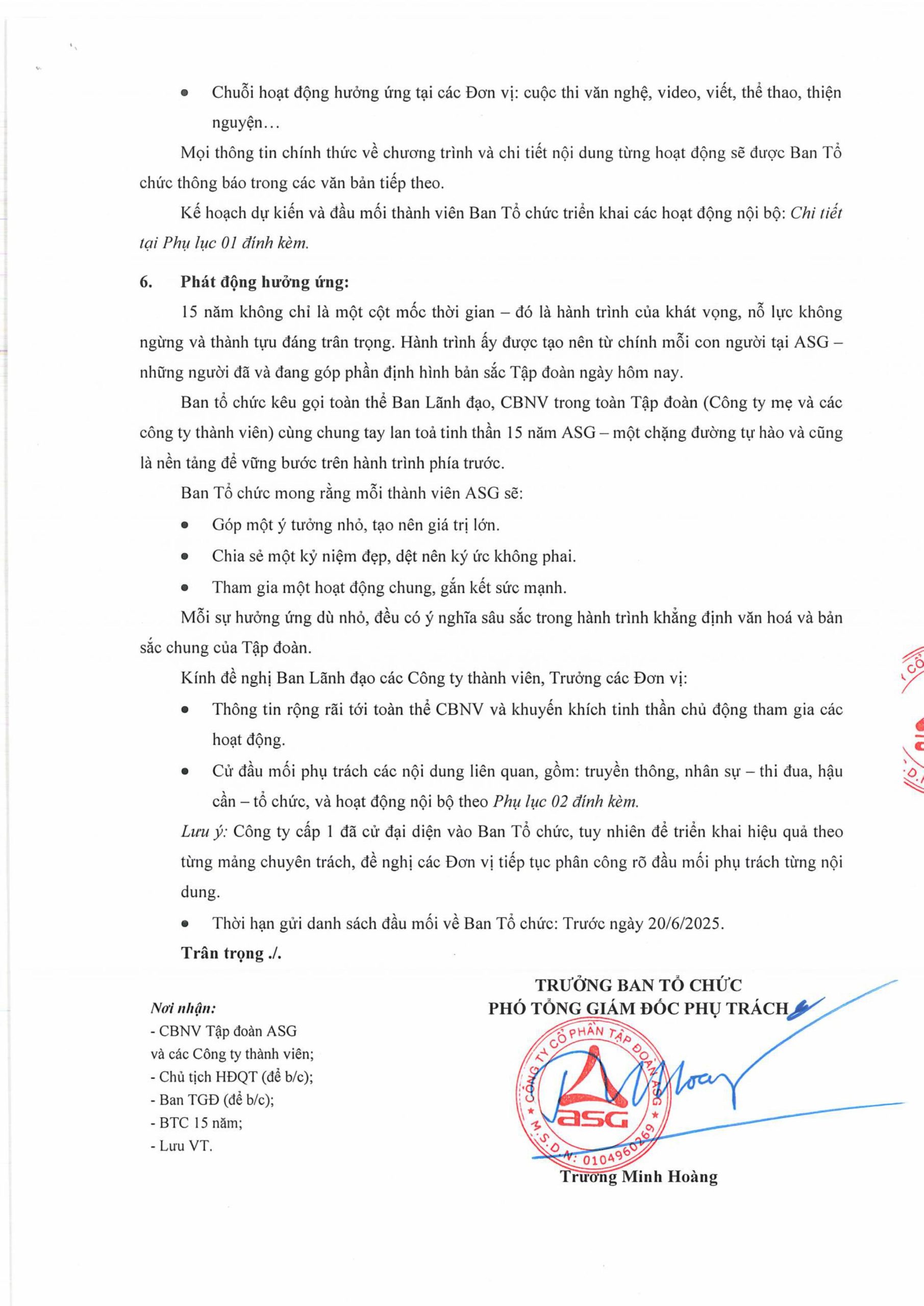 Căn cứ Quyết định số 08/2025/QĐ-CTHĐQT/ASG ngày 24/04/2025 của Chủ tịch HĐQT về việc thành lập Ban Tổ chức Lễ kỷ niệm 15 năm thành lập Tập đoàn ASG, Ban Tổ chức trân trọng gửi Thông báo phát động chương trình (đính kèm), đề nghị Trưởng các Đơn vị và Toàn thể CBNV Tập đoàn ASG phối hợp triển khai các nội dung sau: