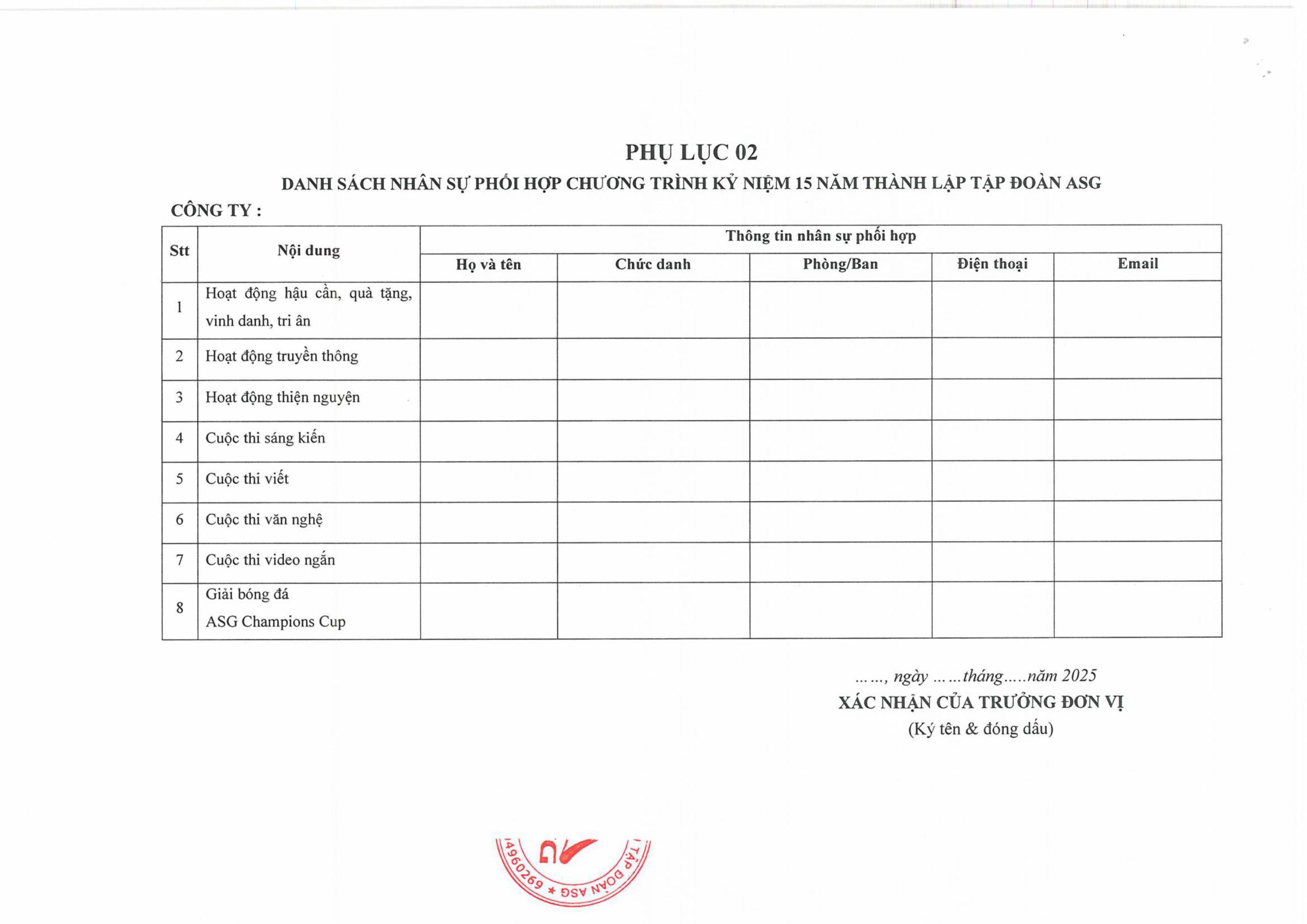 Ban Tổ chức tin tưởng rằng, với sự phối hợp tích cực và trách nhiệm cao từ Trưởng các Đơn vị cùng toàn thể CBNV, chương trình kỷ niệm 15 năm thành lập sẽ diễn ra thành công, để lại dấu ấn sâu sắc và lan tỏa mạnh mẽ tinh thần ASG trong toàn hệ thống.