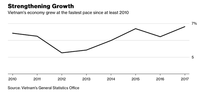 Các khoản đầu tư bởi Samsung, LG và Nestle đã khiến Việt Nam trở thành trung tâm sản xuất lớn, đẩy nhanh tốc độ tăng trưởng – lọt top những quốc gia phát triển nhanh nhất trong khu vực. GDP tăng 7,4% trong quý đầu tiên của năm và chính phủ dự đoán rằng tốc độ tăng trưởng kinh tế sẽ đạt cao nhất là 7,5% trong năm nay. Chính phủ cũng đang tìm cách thu hút nhiều du khách hơn và phát triển du lịch như một ngành công nghiệp mũi nhọn.